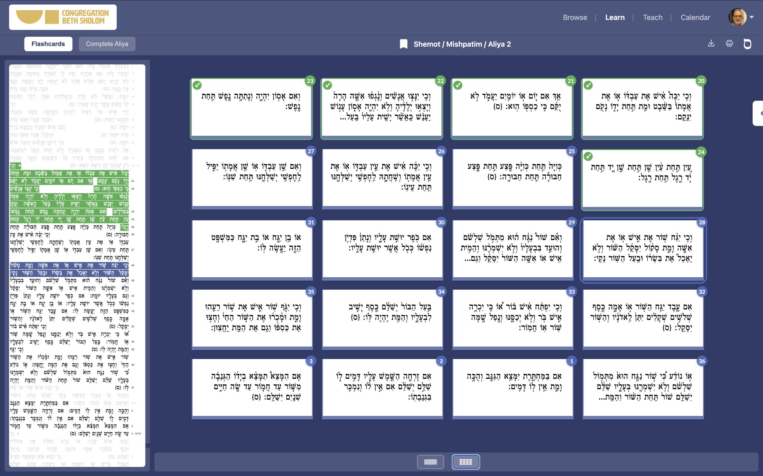 Bookmarking and multiple learning styles. Bookmarks provide a direct route to an aliya within Learn. Users can create personal bookmarks in Browse, or accept invitations from clergy or tutors. Learn optimizes the learning experience using Focus-in-Context across multiple learning styles. Students can use Aliya Flashcards, a new feature unique to Virtual Tikkun, to work on individual pesukim (verses). Or they can learn and practice the entire aliya. In both cases Focus-in-Context highlights the aliya or verse in the context of their unique Torah.